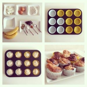Banány rozmačkáme a smícháme s tvarohem. Poté přidáme mouku a vajíčka a promícháme. Přidáme mléko, skořici, prášek do pečiva, med a sůl. Zamícháme. Nyní vkládáme do košíčků asi jednu PL směsi. Kdo má rád čokoládu, může ji nasekat a přidat nahoru. Nyní pečeme na 180 stupňů asi 25 minut.